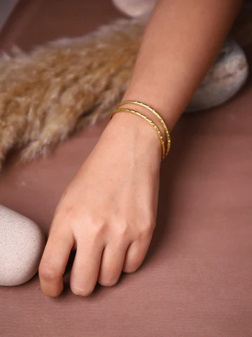 A minimalist yet elegant gold-tone double bangle bracelet featuring two slender bands joined in a stacked design. Each band has a subtle linear or cut-style texture that adds visual interest while keeping the overall look refined and lightweight. The bracelet hugs the wrist comfortably and offers a timeless, versatile style suitable for both everyday wear and special occasions.