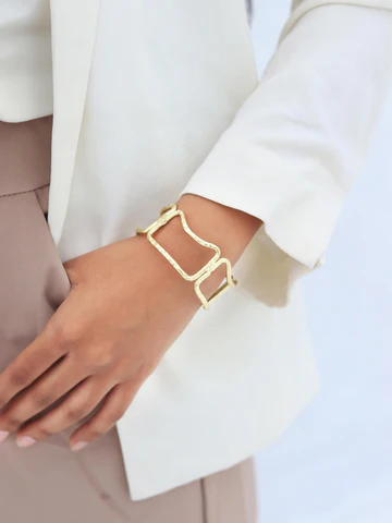 A bold and contemporary gold-tone open-frame cuff bracelet featuring geometric, window-like shapes linked together in an artistic, sculptural design. The bracelet’s fluid, irregular edges give it a modern, statement-making appeal while maintaining a lightweight and comfortable fit. Its open silhouette adds visual interest and pairs effortlessly with minimalist, chic, or formal outfits—perfect for someone who loves distinctive, art-inspired accessories.